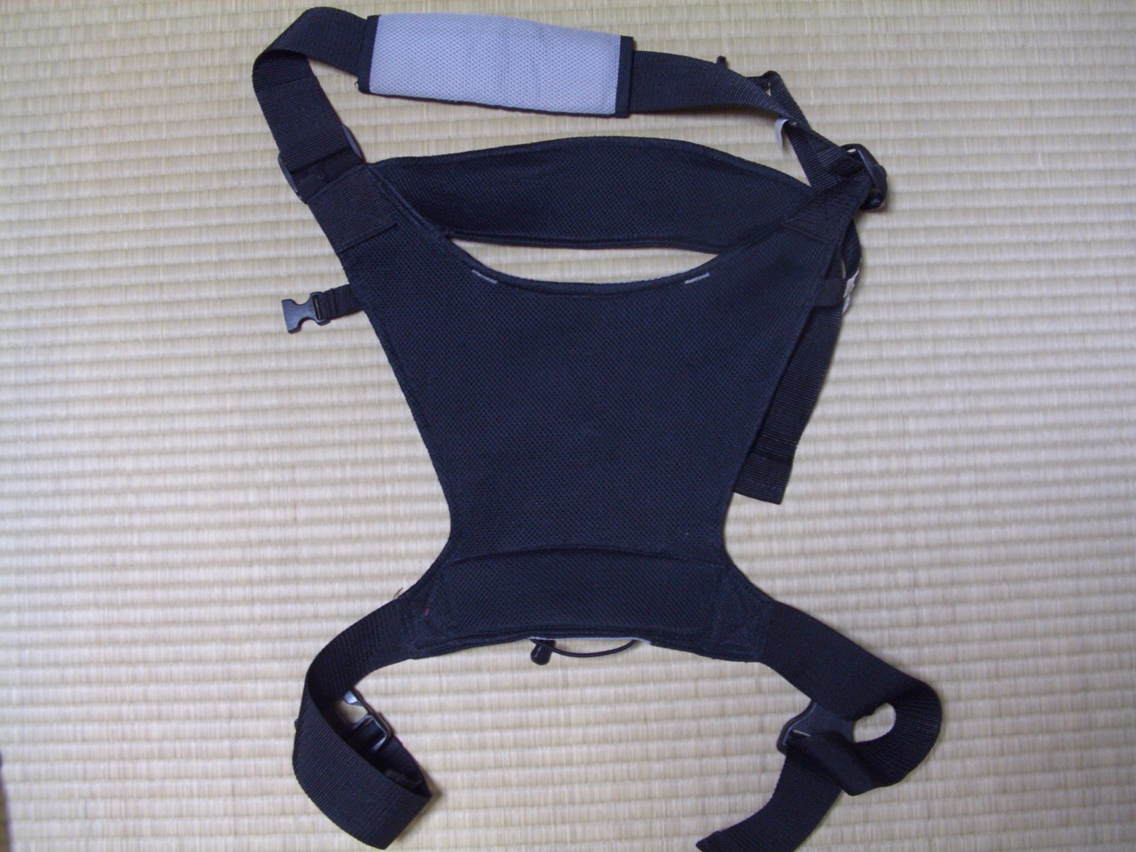 The top part goes around your head, the bottom strap latches itself around your waist, and the itty-bitty strip in the middle goes around the baby.