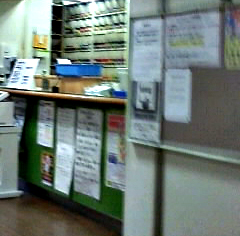 The cash register counter, complete with notices (many of them handwritten in pen or marker).