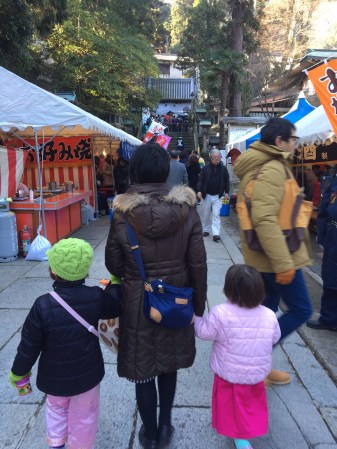I’ve blogged about spending the holidays with my wife’s family before, but rarely posted pictures. Also, this is the first year of our marriage that we stayed at home. So, instead of braving the teeming masses of train-weary travelers visiting hometowns around the archipelago, we were able to brave the teeming masses of locals who visited the nearby shrines and temples for hatsumode (初詣, the first shrine or temple visit of the year). Our local temple is Hozanji 宝山寺, properly 寶山寺, which also runs our nursery school. There’s a festival atmosphere; after praying for peace and prosperity (and throwing in a few 5-en pieces for “good luck” to the donation bin), we snacked on tako-yaki (たこ焼き, dumplings of fried octopus, though the version we ate also had quail eggs in them), okonomiyaki (お好み焼き, usually called “Japanese pizza,” although “cabbage pancake” is more like it), frankfurters on a stick, and “baby castella” (ベビーカステラ, tiny sponge-cake pastry puffs). The adults also had amazake (甘酒, sweetened, unfiltered warm sake, which unfortunately had been watered down by the festival vendor; supposedly a drink of this at New Year’s guarantees health the rest of the year).