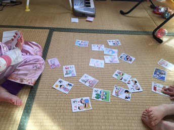 After returning from the temple, we played karuta (カルタ, a card game in which one person reads a phrase and contestants try to touch the matching card on the floor before the other players). We use a set of cards specially made by the nursery school to teach Japanese hiragana syllabary. Only then did we hand out the otoshi-dama (お年玉, gift money; young children get a couple thousand yen in small envelopes with various TV show characters).